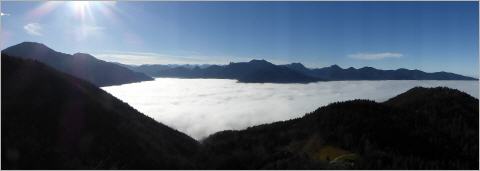 Dann der schönste Moment: Die Sonne drang durch die dünne Nebelschicht, es wurde heller, und das Laub unter meinen Schuhen raschelte, es war trocken, ich konnte es brechen. Der Blick auf das Meer aus Watte wurde frei, und über der wie mit einem Lineal gezogenen Wasserlinie ragte kulissenartig die Tegernseer Bergwelt in den blauen Himmel.
