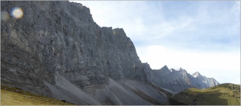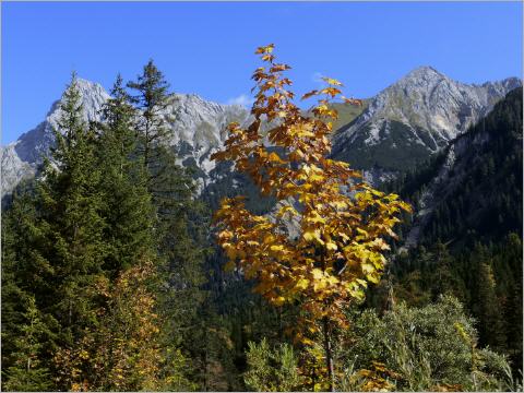 Mehr und mehr setzte sich dann eine große Wolkenmütze über das Massiv, noch aber blies der Föhn und begleitete mich durch das herbstliche Laliderertal. Leider war auch die Sonne hinter den Wolken verschwunden, und Fotos ohne Licht ist wie Weißwurst ohne Senf.