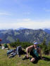 Los ging's auf dem privaten Hirschberg-Parkplatz in Scharling, einem Ortsteil von Kreuth. An der Einfahrt hängt ein gelber Briefkasten, in den man die 2,00 Euro Parkgebühr einwerfen darf. Hirschberg 3 Stunden, steht auf dem Schild für Wanderer. Auf dem Forstweg, der gut zu laufen ist, kommt nach einer guten halben Stunde links ein Abzweiger, ein knackiger Steig, der leider viel zu früh wieder auf den Forstweg trifft. Über das Hirschberghaus geht es auf den Gipfel. Hier hat man 990 Höhenmeter und etwa 6 Kilometer in den Beinen - und eine tolle Aussicht: Wetterstein mit Zugspitze war zu sehen, das Karwendel, und was mich ganz besonders begeisterte, war der Blick auf den Bergkam gleich gegenüber, den Kampen, auf dem ich vor einer Woche mehr gekraxelt als gelaufen bin.