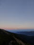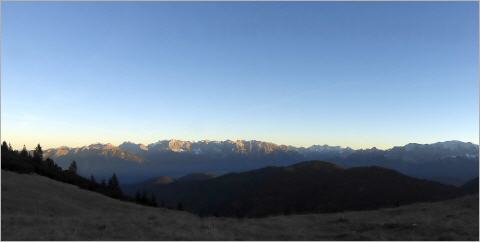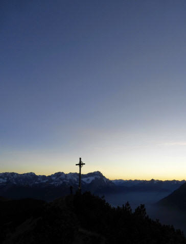Neue Kraft und Glücksgefühle tragen uns den leicht ansteigenden Pfad zum Sattel zwischen Bischof und Hohen Fricken hinauf, und weiter über einen latschenbewachsenen Bergkamm zum Gipfel des Hohen Fricken. Dort stehen wir und blicken zur Zugspitze und hinunter auf die Lichterketten von Garmisch-Partenkirchen, schauen ins Loisachtal und weit nach Norden, wo der Nebel halt gemacht hat - und genießen die letzten Minuten der Dämmerung. Von milder Luft eingehüllt spüren wir intensiv die Bergeinsamkeit, die man immer seltener findet.