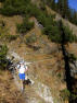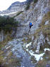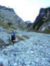Auf dem Forstweg folgen wir den Wegweisern Richtung Krottenkopf. Schilder zur Hohe Kisten gibt es nicht. Wir laufen um den Gipfel des Brandecks herum, zu unserer Freude oft in der Sonne, und landen auf einem Trail. Christian und ich schrauben uns die steile Flanke hoch, biegen an einer weiteren Gabelung rechts ab und steuern direkt auf die noch weit entfernte Hohe Kisten zu. Noch eine steile seilversichterte Schrofenflanke ist zu queren, und wenige Minuten später erreichten wir das leider schattige Pustertal (1324m) mit seiner Jagdhütte. Gut 1000hm liegen hinter uns, Zeit, ein wenig zu verweilen. Wir schauen hinauf zu den nördlichen Ausläufern des Estergebirges und unseren weiteren Weg. Mit einem "Auf geht's!" rennen wir weiter, laufen über einen Steig durch Latschen bis zu einer schlecht sichtbaren Abzweigung, wo wir uns nach rechts wenden. Die Latschen werden weniger, der Schotter nimmt zu. Ein wenig holprig geht es hinauf zum Kessel des Pustertalkars, bis uns stufiges Gelände und die Hilfe der Hände hinauf zum Grat bringen.