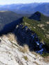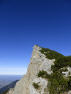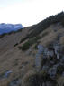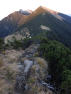 Der Krottenkopf. Auch der in der Sonne. Der Aufstieg nicht schwer. Wir schauen auf die Uhr. Eigentlich war der Gipfel eingeplant, aber die Winterzeit im Nacken rät uns zum Weiterlaufen. Blinker rechts raus und ab geht's einen almigen Hang hinunter, den Wiesensattel des Hennenecks. Weiter geht es leicht abwärts, dann taucht der Bischof vor uns auf. Christian möchte ihn von hinten bestei ... äh, wie sage ich das jetzt am besten? Von Norden kommend hat der Bischof einen recht markanten Grat, der über ein kurzes steiles Schotterfeld zu erreichen ist. Von dort kommt man auf die rechte Flanke, auf der es nahe am Grat nach oben geht. Das ist der normale Aufstieg, antwortet Christian auf meine mit Zweifeln gespickte Frage. Wir packen unsere Klettergurte aus ... Schmarrn. Ich gehe auf allen Vieren nach oben, bis zu einem Punkt, wo es für meinen Geschmack nicht mehr lustig ist. Wir drehen um. Eine gute halbe Stunde Zeitverlust verbuchen wir auf unserem ohnehin knapp bemessenen Zeitkonto.