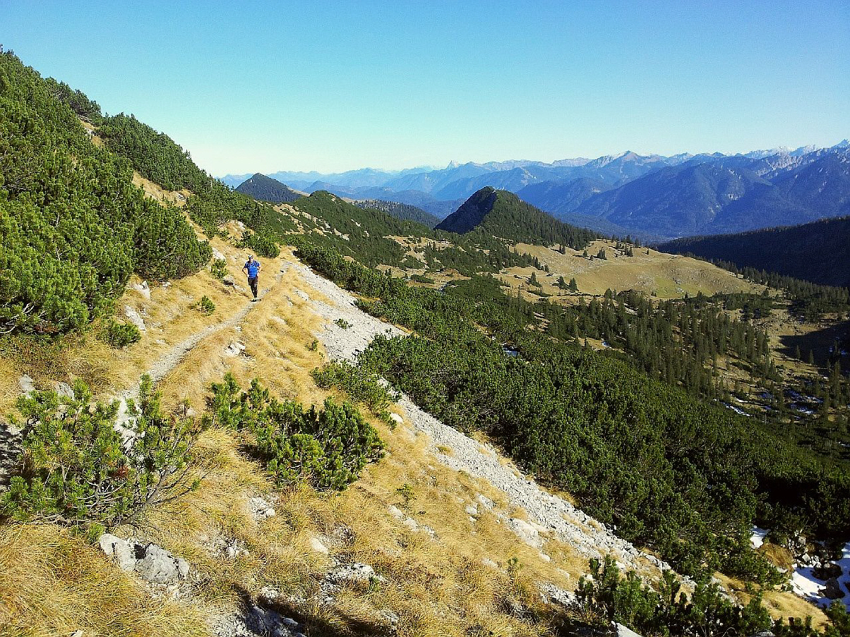 Besser geht nicht! Ich meine das Wetter. Es weht ein leichter Südwind, die Sonne wird 10 Stunden vom strahlend blauen Herbsthimmel scheinen, die Fernsicht ist in Worten kaum zu beschreiben. Beschreiben ist auch schon das Stichwort für das, worauf ich hinauswll: Diese lange Tour durch das Estergebirge wird in einem Buch für Speedhiker hochgelobt und technisch als nicht schwierig bezeichnet, nur konditionell sei sie eine Herausforderung. Dann schaun wir mal mal ...