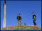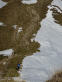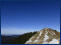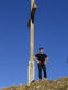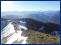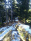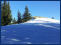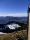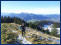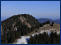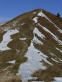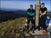 Die Hütte ist geschlossen, dafür liegt ein Teil der Terrasse in der Mittagssonne. Ein junges Pärchen sitzt da, vor sich die Wanderkarte ausgebreitet. Die junge Dame trägt ein Top mit Spaghettiträger, er einen Kopf ohne Haare. Auf den Gipfel wollen sie nicht. Sie bieten uns Platz an, wir aber lehnen dankend ab und stehen lieber in der Sonne, nicht das unsere Beine noch auf die Idee kommen, faul werden zu dürfen. Christian und ich ratschen über dies und das, wie wir das oft machen, blicken hoch zum grünen Gipfel, und dann genügt auch schon ein Blick und weiter geht die Sause. Kurz durch den Schnee und dann in den Wald hinein. Und wieder bringt uns ein trockener wurzeliger Trail weiter nach oben. Leider ist der viel zu kurz. Schon spuckt uns der Wald wieder aus und wir landen direkt auf einem Schneefeld. Von Spur zu Spur gehüpft geht es bald wieder trockenen Fußes einen grasigen Rücken hoch, und in wenigen Minuten erreichen wir das Gipfelkreuz nebst dem Franken, der bei Regen losgefahren und jetzt vor lauter Sonne, Fernblick und Windstille ganz aus dem Häuschen ist. Nach einer ganzen Weile setzt er seine Mütze auf und verläßt uns - endlich allein.