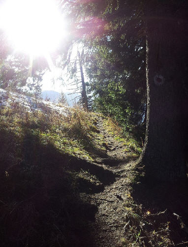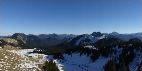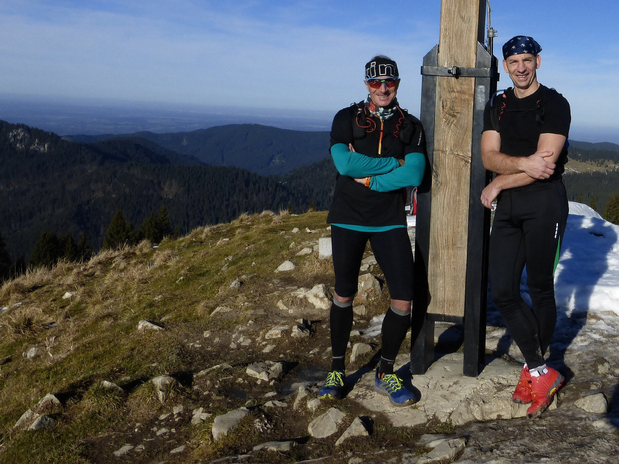 Christian mag sich gar nicht vom Gipfel trennen, mir aber wird nach einer halben Stunde dann doch kühl, und so machen wir uns auf ins Tal. Wir blicken nach rechts unten. Dort liegt Lenggries, noch immer in der Sonne. Das Isartal ist hier breit und verläuft von Süd nach Nord, da hat man auch im Winter lang Sonne. Wenn sie denn scheint. Heute und auch schon die letzten Tage macht sie das aus voller Kraft. Mit stacksigen Beinen geht's den Gipfelhang hinunter; noch kalt ist die Muskulatur nicht im Downhill-Modus. Christian schlägt vor, einen anderen Abstieg zu wählen, und so laufen wir im kaum gespurten Schnee ein Stück geradeaus weiter. Der Blick auf den weiteren Verlauf um eine Kurve herum gefällt mir nicht, da ich nicht einschätzen kann, was dann folgt, und so machen wir uns auf den Weg, den wir heraufgekommen sind. Und das war gut so. Denn der trockene Trail hinunter zur Lenggrieser-Hütte und der dann folgende, waren richtig gut zu laufen, meist auch sehr schnell. Das ist es doch, worum es bei der Trailrennerei auch geht: Sich mit einem souligen Downhill zu belohnen für einen nicht minder schönen, aber meist anstrengenden Anstieg - neben dem Genuss, den die Schönheit der Natur dem anbietet, der das Angebot zu schätzen weiß.