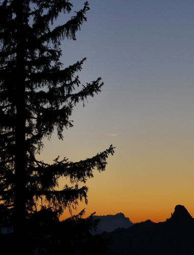 Mir wieder warm geworden laufe ich mit dem Hildebrandslied von Menhir in den Ohren bei fortgeschrittener Dunkelheit weiter, noch auf dem Forstweg, dann auf dem steileren Pfad. Die Stirnlampe ist vorbereitet. Ich brauche sie aber nicht, das Restlicht reicht. Noch einmal treffe ich auf den treuen Begleiter und sein Herrchen. Dann ein heller Fleck, aus den kleinen Fenstern der Wallbergmoosalm leuchtet Licht. Zwei Männer sitzen biertrinkend an einem Tisch und scheinen sich gut zu unterhalten. Ich schweige und nuckle dann an meinem Trinkschlauch. Tagesausklang.