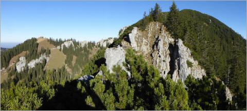 Ich bin am Grubereck (1664m) angekommen, es ist 14:40 Uhr. Ab hier wird der Weiterweg über den Verbindungsgrat als mittelschwere Bergwanderung eingestuft. Das Plätzchen vor dem Latschenbusch ist trocken, es ist windstill und die Sonne scheint mit ihrer ganzen Kraft. Wie oft wollte ich mich auf meinen Touren einfach mal, wie es so viele andere auf dem Berg auch machen, in die Sonne legen und Nichtstun. Wozu auf den Gipfel hatschen, wenn ich mich hier ausruhen und an der absoluten Stille erfreuen kann? Stille? Mitnichten. Jemand pfeift hier ziemlich laut eine fröhliche Melodie, ist aber nicht zu sehen. Ist immer noch nicht zu sehen, nur zu hören, von dort, wo ich auch hergekommen bin. Dann biegt ein junger Asiate um die Ecke, mit nacktem Oberkörper seinen kleinen Rucksack tragend. Ein kurzer Plausch, dann ist er auch schon wieder um die nächste Ecke verschwunden und die Stille kehrt zurück. Ich hatte mich inzwischen umgezogen und die nassen Sachen in die Sonne zum Trocknen gelegt. Nach einer halben Stunde mache ich mich auf den Weg zurück zum Setzberg - der Antwort auf meine ungeklärte Frage schon ein weniger näher gekommen und wissend, dass sie nicht abschließend beantwortet werden kann, sondern nur von Fall zu Fall.