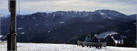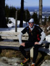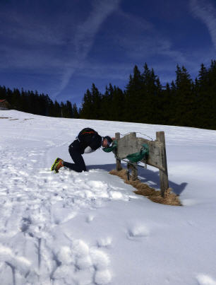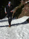 Ein paar Laufminuten später kam ich zur Bergstation der Blombergbahn. Nahezu alle, die hier ankamen, hatten einen Schlitten dabei. Mit Schlitten hatte ich ja bereits auf der Rotwand Bekanntschaft gemacht, mit ein paar daherkriechenden Rodlern, die mehr Angst vor mir, als ich vor ihnen hatte. Hähä ... nach ein paar Metern Fahrspaß mussten sie auch schon ihre Schlitten wieder tragen, während ich über den schneefreien Forstweg jagte. Ich ahnte ja nicht, dass sie nur auf dem Weg zur eigentlichen Rodlbahn waren. Bald erreichte ich das Blomberghaus, wo ich mich umzog, die Sonne genoß und überlegte, wie es weitergehen soll. Mein Plan war, den Zwiesel auszulassen und dafür ein Stück auf der Nordseite des Bergs den Fortsweg Richtung Blomberg-Parkplatz hinunterzulaufen. Ich kannte den Weg von vor einem Jahr, wo er schneefrei war, und erinnerte eine Stelle, wo er über eine kurze Verbindung auf den steilen Weg entlang der Sommerrodelbahn trifft. Auch erinnerte ich mich an die kleinen Schildchen mit den Höhenmetern, die jeweils 50 solcher anzeigen, da hier im Sommer ein Berglauf stattfindet.
