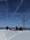 Vom Heiglkopf zum Blomberg geht es erstmal ein Stück runter und dann wieder rauf. Bald landete ich auf einem Sattel mit dem Blombergkreuz auf 1205m Höhe. Das aber ist nicht der Blomberg. Der liegt 43m höher. Auf dem Weg zu ihm gibt es eine Labestation für Trailrunner, die sich hier das Mitführen einer Trinkblase sparen können. Ehrlicherweise muss ich aber sagen, dass nicht ich auf die Idee kam, hier ein Foto zu machen, sondern zwei junge Damen, die mich baten, sie knieend und schlürfend und sich halb totlachend zu fotografieren. Natürlich revanchierten sie sich gerne, und ich altes Rindvieh machte mit. Oben angekommen mischte ich mich unters Volk, das von hier hinunter auf das Kreuz blickte und so mancher darunter sich sicherlich sagte, dass es blöd wäre, diese 43 Höhenmeter und 10 Minuten zum Kreuz hinunterzugehen. Zu Kreuzen steigt man nauf, aber nicht hinabi. Der Blick in die Ferne war von hier aus sicherlich auch schöner.
