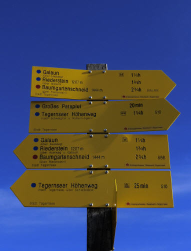 Ein kleines Problem für mich aber war es heute, den tollen Trail hoch zum Galaun zu finden, der mir Ende November so viel Spaß gemacht hatte. Vom Galaun kommend hinunter hat er auf dem Wegweiser einen Namen, "Tegernsee - über Leeberg und Sonnenbichl", nicht aber, von unten nach oben. So, wie zur Neureuth hoch der Sommer- und Bayernweg nahezu parallel verlaufen, so gibt es auch zum Leeberg/Galaun hoch zwei Wege, die oben zusammentreffen. Hier aber ist nur der Sonnbichlweg ein ausgewachsener Bergpfad. Zu Hause der Blick auf die Karte. Ich hätte nur ein Stück weiterlaufen müssen. So ist er zu finden: Von Tegernsee/Schießstätte her kommend, ist es der zweite Pfad nach oben, der südlichere. Vom "Großen Paraplui" aus südlicher Richtung kommend, ist es entsprechend der erste Pfad.