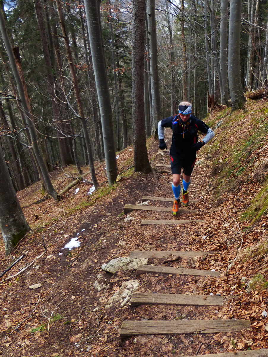Wieder waren die Trails überwiegend trocken. Matsch gab es nur da, wo der Wald licht war. Einmal mehr war dann bald meine Impulskontrolle gefordert, am Berggasthof Riederstein, wo ich, wenn auch nur schwer, den auf schwarzen Tafeln angebotenen Leckereien widerstehen konnte. Weiter gings hoch zur Kapelle, und diesmal nahm ich den Kreuzweg mit den vielen Stufen. Damit erspare ich mir im Fitness-Studio eine Runde der wenig geliebten Ausfallschritte mit Hanteln, die notwenig sind, um meinen Gluteus Maximus sommerfit zu machen.