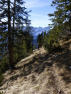 An einem Tag wie heute ist es schwer, sich satt zu sehen, und so packen wir, jeder für sich, in Gedanken die schönsten Eindrücke ein und machen uns mit ihnen auf den Rückweg. Der führt uns hinunter in Richtung Roßkopf (1839m). Die weglose Senke zwischen ihm und dem Altjoch hat weniger Schnee als befürchtet, allerdings erschweren auch hier die Kuh-Trails das Laufen. An einen Flow ist nicht zu denken. Nicht lange aber, und schon sind wir wieder auf einem trockenen Trail, der uns an der Kreuzung ausspuckt, wo wir hochgekommen sind. Wortlos schauen wir uns an und freuen uns. Beide wissen wir, was jetzt kommt: Einer der flowigsten Downhills den wir kennen, 800 Höhenmeter in vielen Schleifen hinunter, technisch einfach und nahezu frei von Stufen und Felsen, ein Singletrail wie aus dem Bilderbuch, der immer wieder den Blick frei gibt auf das mächtige Massiv der Sonnjochgruppe mit der Bettlerkarspitze vor uns. Diese grauen Felswände erleben wir unecht, wie eine riesige in Grautönen gemalte Theaterkulisse, die von einer Riesenhand über den Horizont geschoben wurde. Auch wenn wir noch immer in der Sonne unterwegs sind, auf die Feldwände dort fällt nur noch Restlicht, das jegliche Kontur verschwimmen lässt.