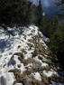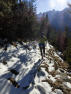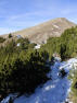 Langsam traben wir los auf der schneebedeckten Mautstraße talauswärts, eisige Luft durch die Nasenlöcher ziehend, ungewohnt noch, aber wohl bald Normalität. Wir erreichen das Schild Schönalm, von wo aus der Aufstieg (für uns Auflauf) zur Fleischbank beginnt. Erstmal geht es weglos über eine vereiste Wiese und dann rechterhand über einen Bach, bis uns ein markierter Steig Meter für Meter der Sonne näher bringt, und der Wärme, denn auch heute wird es oben viel wärmer sein als unten. Nach ein paar Serpentinen mit wenig oder keinem Schnee bleiben wir stehen und schauen der Sonne dabei zu, wie sie sich zögerlich hinter einem Felsmassiv hervorschiebt. Schon ist es einige Grad wärmer und beim Weiterlaufen beginne ich zu schwitzen. Christian im Prinzip auch, nur hat der sich von einer Schicht befreit, zudem läuft er heute ohne Trinkrucksack. Er liebt es minimalistisch und hat heute nur eine Trinkflasche zum Befüllen dabei. Von unserer Kompar-Fleischbank-Tour wissen wir, dass es hier zwei Bäche gibt. Ideal für einen Testlauf.