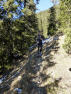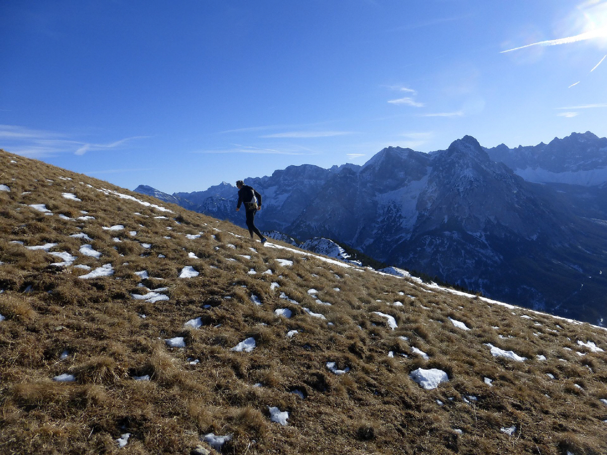 Das fehlende Bier hier an der Hütte macht es uns leicht, uns wieder loszueisen (Dieses schwache Verb mag hier so gar nicht passen). In Schleifen laufen wir weiter bergan, durch lichten Wald und vorbei an Latschen, bis wir eine Wandertafel erreichen. Diese weist zur Schönalm. An dieser Kreuzung werden wir auf dem Weg nach unten rauskommen, wenn wir die Runde oben herum gelaufen sind. Erstmal geht es weiter geradaus hoch zum Kamm, der die Fleischbank und das Schönalmjoch (1986m) verbindet. Oben angekommen laufen wir unterhalb des Kamms links hinüber, laufen zum ersten Mal durch Tiefschnee, überwinden eine kleine harmlose Kletterpassage, bis der Blick frei wird zum Südhang des Schönalmjochs. Wie der Name schon verrät, ist dieser grasige Berg eine Alm, die selbst im Sommer nur wenig besucht wird. Wo Kühe weiden, sind Furchen, und so springen und balancieren wir bereits auf dem Weg zum Anstieg auf einem Kuh-Trail von Büschelkopf zu Büschelkopf, oder wie immer man dazu sagt, vorsichtig, um nicht mit dem Fuß in einem zugeschneiten Loch zu landen. Im Sommer dürfte dies richtig schwierig sein, vor allem nach Regentagen. Bald geht es weglos weiter nach oben, der Sonne und dem blauen Himmel entgegen. Der Blick hinüber zum Schafreuter hier schon gigantisch. Jede kleine Kontur zeichnet sich deutlich durch den flachen Lichteinfall ab. Die Schafreuter-Tour erinnere ich besonders gern, war es doch der erste gemeinsame Lauf von Christian und mir.