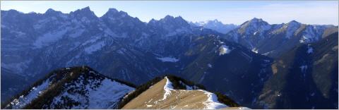 Dieses Gefühl der Freiheit haben wir selten so stark gespürt wie heute, als wir zwei Tage vor Weihnachten schweigend auf dem Schönalmjoch standen und rundum blickten, angekommen im Frühling bei nahezu Windstille und kristallklarer Luft. Wir stehen und staunen, schauen ringsum in den uns lieb gewordenen Karwendel, zur imposanten Soiernspitze, weit hinüber zur Zugspitze, dann wieder in die andere Richtung: Zum Schafreuter, Delpsjoch und Demeljoch. Sogar die Blauberge heben sich deutlich vor dem winterblauen Himmel ab, ebenso Roß- und Buchstein. Imposant auch der Kamm etwas unterhalb direkt vor unserer Nase, der uns hierher gebracht hatte, und der weiter führt hinauf auf die Fleischbank.