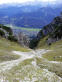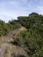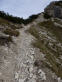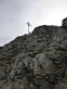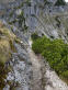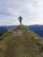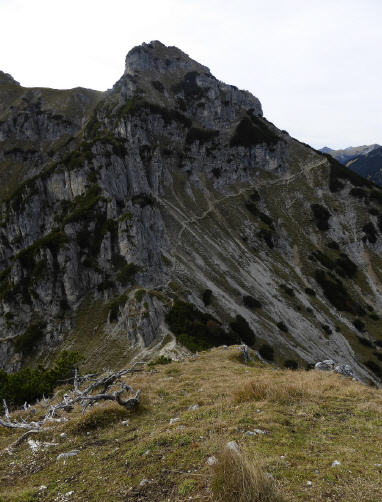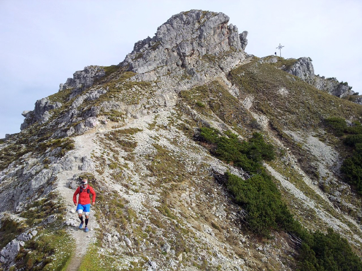 Zurück beim Abzweiger Richtung Kramer wird es steil und schrofig. Meine Erinnerung an diese Passage war verblasst, ich dachte, sie sei weniger steil und kürzer. Ein leichter milder Wind zieht eng an den Hang gedrückt geräuschlos mit uns nach oben. Erwartet hatten wir, dass er hier schon pfeifen würde. Ein ganzes Stück weiter oben findet unser Kraxeln und Steigen ein Ende. Der Wind mausert sich und beginnt in den Felswänden und Fichten zu fauchen. Zwischen Latschen geht es wieder trailig und weniger steil dahin, den Kramer schon im Blick. Nur noch 15 Minuten, rufe ich Christian augenzwinkernd zu, nur noch ein paar Höhenmeter, gleich ums Eck rum; ein Trugschluß, wie so oft. Auch der Kramer täuscht. Wohl mit Absicht, denn der langgezogene Bergkamm mit seinen Neben-, Vor- und Hauptgipfeln - ein richtiger Kramerladen halt - hält eine Überraschung bereit: ein markantes Gipfelchen mit einem schlichten Holzkreuz, das Einheimische Katzenkopf (1817m) nennen und das oft übersehen wird, da der Zustieg nicht beschildert ist. Auf ihm stehen wir und blicken auf die fernen Bergketten. Wenige Schritten bringen uns auf eine schmale grasbewachsene Naturplattform. Dort senkt sich unser Blick und wir schauen tief hinunter auf unseren Weiterweg, der sich im weiteren Verlauf unterhalb des namenlosen Vorgipfels in einem Gegenanstieg durchs Roßkar Richtung Kramer zieht. Großes Kino!