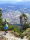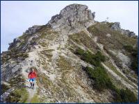 Über schrofige und ausgewaschene sandige Passagen steigen wir erstmal steil hinunter und laufen dann die ansteigende Traverse nach oben. Der Pfad schwenkt nach links und es wird wieder grün. Von Wind keine Spur. Das ändert sich oben am Grat. Hier tobt er sich aus, schiebt, bremst und beutelt uns. Einen Diopter zum Nachjustieren habe ich nicht, ich mache das mit meinen Armen. Christian ist schon wieder vor gelaufen. Geht es auf Gipfel zu, ist er nicht zu bremsen. Während ich noch über die Felsen kraxle und dem Kreuz entgegenhechel, steht er schon oben. Den Wind aber konnte auch er nicht abschütteln, und so beschließen wir, noch nicht zu Mittag zu essen, allenfalls den Nachtisch zu genießen: während Garmisch-Partenkirchen still zu unseren Füßen liegt, baut sich darüber imposant das Wettersteingebirge mit der Zugspitze auf.
