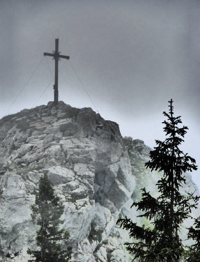 Der Nebel wird lichter und nimmt den Schleier von den Konturen, der Gipfel aber ist immer noch nicht zu sehen; mehr und mehr aber von dem felsigen Steig, der zu ihm hinauf führt. Dann taucht das Kreuz auf. Zu ihm hin bewegt sich aus dem Nebel heraus eine Person, hantiert an etwas herum (am Blechkasten mit dem Gipfelbuch) und steigt dann herunter. Der Wanderer beantwortet gerne meine Fragen, und die Antworten gefallen mir. Voller Neugierde kann ich mich aufmachen, meine geplante Strecke weiterzulaufen, die mich durch eine menschenleere bezaubernde Bergwelt führen wird, 16km weit mit zwei Anstiegen von je 600hm.