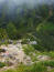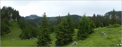 Nachdem ich genug vom vielen Nix gesehen habe, steige ich über die Felsen ab und laufe weiter nach Osten. Erst einen Wiesenhang hinunter, dann geradeaus auf einer Traverse, die mich direkt zur Käserwand (1675m) führt, eine beliebte Kletterwand (Südseite) für Sportkletterer. Von Norden her ist sie relativ leicht zu erklimmen. Ich erspare mir das. Mehr als über die Südwand hinunter auf meinen weiteren Weg zu gucken, ist sicherlich nicht drinn. Der führt mich erstmal ein paar hundert Meter direkt an den steilen Wänden der Käserwand entlang, bevor es auf zwei Kilometern steil 600hm hinuntergeht auf das Höhenniveau, von dem aus ich gestartet bin. Mal ist der Pfad aufgeweicht und rutschig, dann wieder übersäht mit nassem Kalkstein, so richtig zum Laufen komme ich selten. Beim Hinuntersteigen rutsche ich zweimal kurz hintereinander nach hinten weg und kann mich gerade noch über ein "langes" linkes Bein auffangen. Mein Patella japst. Ich verpasse ihr einen Maulkorb und Ruhe kehrt ein.