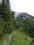 Ab etwa der zweiten Hälfte laufe ich einsam auf schmalen Pfaden weiter über saftig grüne Wiesen und durch hüfthohes großblättriges Zeux, eine Art Berggemüse vielleicht? Unten angekommen erreiche ich einen Forstweg und finde es angenehm, mal wieder Gas geben zu können. Kein Mux mehr von meiner Patella. Das ist gut so, denn noch habe ich mehr als die Hälfte der heutigen Strecke vor mir. Ich erreiche eine Wandertafel: Brannenburg 2 1/2 Stunden und Mitteralm. Ich biege ab und lande endlich wieder auf einem Trail, allerdings in einer dunklen, feuchten Umgebung im tiefen Wald. Nass ist es und immer wieder matschig. Ich quere die Trasse der Zahnradbahn und laufe weiter im Schatten auf nassem Trail und Stufen hoch und runter. Wieder passiert mir ein Missgeschick: Auf einem nassen Holzbalken rutsche ich weg, kann mich aber auffangen, da ich meine linke Hand am Geländer hatte.