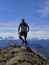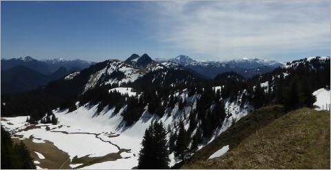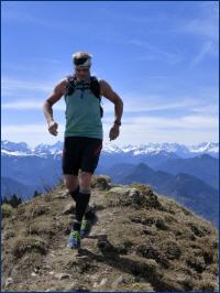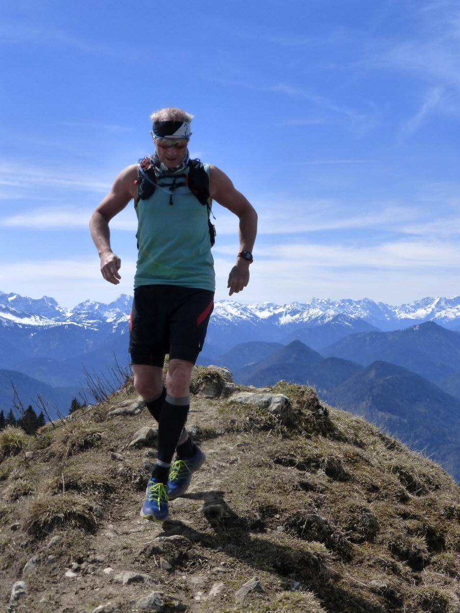 Mein Gipfelchen dagegen leuchtet sympathisch Grün und ist nur einen Katzensprung entfernt. Geschwind geht es die paar Meter über matschigen Schnee, weiter auf trockenem Trail in den Wald hinein und oben wieder hinaus. In der Mittagshitze laufe ich unter wolkenlosem Himmel auf einen Kamm zu, von wo aus es nach links hoch zum Seekarkreuz geht. Klack, klack ... ein paar Fotos, und ich mache mich bereit für den Endspurt. Ich bin froh, wieder auf Pfaden ohne Schnee unterwegs sein zu können. Auf dem Gipfel sind überwiegend ältere Herrschaften zu Gast, und was ihnen hier und heute aufgetischt wurde ist Ruhe, Wärme und ein Panoramablick der allerfeinsten Art. Der Guffert, der alte Protz, dominiert Richtung Süd-Ost. Auch ich genieße all das, dazu verköstige ich mich mit Mitgebrachtem: In Wasser aufgelöstes Hafermehl für den Kopf und BCAA für eine rasche Proteinzufuhr. Fett habe immer dabei. Da kenne ich mich mittlerweile gut aus.