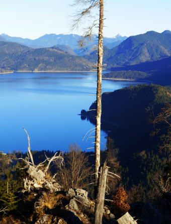 Der Abzweiger mit Schild kommt dann nach 2,75km. Liebe Leute vom Bergverlag Rother: Wenn ihr euch schon die Infos von Dritten holt, dann schreibt doch bitte richtig ab: Hier steht es richtig: Nach ca. 1h auf ca. 1100hm geht ein nicht sehr gut markierter Pfad rechts von der Forststraße ab (beschildert Schild am Baum im (!) Wald). Diesem folgen wir. (Vorsicht: Wenige Minuten davor geht auch ein Weg rechts ab, (ohne Schild, kein Wald) diesen ignorieren). Ziemlich steil führt der wurzelige und mit Felsen durchsetzte Pfad nach oben auf einen Bergrücken. Ich lande auf einem Friedhof der Bäume. Ein Sturm muss hier vor Jahren gewütet haben; ein trauriger Anblick. Da mag auch der feine Ausblick auf den Walchensee nicht richtig Freude machen. Drüben der Jochberg und die Benediktenwand, beide schneefrei. Und immer wieder der Schafreuter mit breiter Brust.