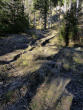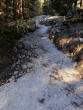 Ich laufe weiter den trockenen Trail hoch und denke, dass ich mir mit der heutigen Schuhwahl keinen Gefallen getan habe. Mit Spikes über trockene Pfade, die häufig mit Steinblöcken gespickt sind!? Wie wird das beim Runterlaufen werden? Dieser Trail hoch ist eine Abkürzung und trifft wieder auf die Forstpiste. Statt geradeaus weiter in den Wald hineinzulaufen, verführt mich der schnee- und eisbedeckte Forstweg zu einem Sprint darüber hinweg, leicht bergab, immer weiter und weiter. Jetzt ist der Schuh in seinem Element. Dann entdecke ich, dass ich hier keine anderen Spuren entdeckt habe. Ich drehe mich um. Etwas entrückt erstreckt sich der Simetsbergs. Also zurück. Wie schön, kann ich zwei Kilometer mehr auf meinem Konto verbuchen. Bei den gelben Schildern geht es rechts hinauf weiter, sieht aber aus wie ein trockenes Bachbett. Ich gucke links und rechts, kann aber keinen Pfad sehen. Also ab über's Geröll, hin und wieder rechts daneben. Es ist wieder schattig und kalt. Keine 50 Höhenmeter weiter, und ich lande im Winter. Der Pfad ist eisig, schneebedeckt und wenig gespurt, zudem führen verschiedene Spuren durch das lichte Wäldchen in diesem Graben hinauf. Schön ist es hier, und sehr romantisch. Meinen Schuhen gefällt das alles auch. Oben aber, auf der sonnigen Hochebene, werden sie wahrscheinlich ihre Mundwinkel wieder nach unten ziehen. Ich befürchte, dass es dort sehr batzig sein wird.