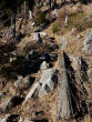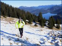 Schräg fällt die Sonne auf den Friedhof der Bäume, strohtrocken wiegen sich lange Gräser im Wind, der heute kaum zu spüren war. Ich erreiche die Forstpiste. Der geleckte Untergrund und das sanfte Gefälle erlauben es, richtig Gas zu geben, da ein Überpacen mit Kontrollverlust hier kaum möglich ist. Auf halben Weg hinunter, es ist kurz nach 15:00 Uhr und das Brennen in den Oberschenkel wird intensiver, kommt mir ein Trailrunner entgegen. Gefragt, wo er hin will, antwortet er kurz, auf den Simetsberg. Ich denke mir noch, da bist du aber früh dran. Kaum gedacht, vollendet er seinen Satz (Christian: bitte weghören, sonst kommst du mir noch auf dumme Gedanken ;-): "Ich bin über den Herzogstand (1731m) und Heimgarten (1790m) gelaufen und dann hierüber. Tolle Leistung, Hut ab! Zum Grat befragt antwortete er, dass er zwar ein paar eisige Stellen hatte, aber sonst gut zu laufen war. Spikes hatte er keine.