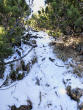 Irgendwann muss ich doch wieder runter, das neue Jahr wartet. Und der erste Flieger. Gleich oben in der engen Latschengasse falle ich einer Frau zu Füßen, die mich vorbei lassen wollte. Es war nicht Schnee oder Eis, sondern Batz. Ein wenig übermütig und an die winterlichen Verhältnisse noch nicht angepasst, zieht es mir ein paar hundert Meter weiter wieder die Füße weg, und der Allerwerteste muss es nochmal ausbaden. Und weil aller guten Dinge ... diesmal drifte ich seitwärts weg und lande mit dem Bauch auf der schneebedeckten Wiese. Weil weitere Landungen hier auf diesem Hang eher sanft ausfallen sollten und ich übermütig bleiben will, verweigere ich ein langsameres Tempo, dreckig bin ich eh schon. Ich erreiche die kleine Hütte, verabschiede mich vom Übermut und laufe wieder hinein in den Wald mit einigen steilen steinigen und eisigen Passagen - der Schuh mit den Spikes, deren Spitzen aus Carbon sind, packt hier richtig zu. Skeptisch bin ich noch, wenn es mit den Spikes über glatten Fels geht, aber auch hier arbeitet der griffige Gummi gut.