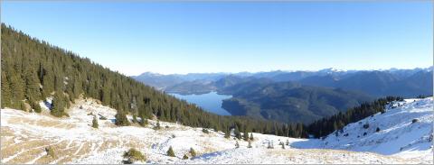 Es wird heller. Über mir die kleine Versorgungshütte vor blauem Himmel. Und dann? Überraschung! Ein Sonnenhang mit Schnee. Wo gibt'sn sowas? Ringsherum unter 2000hm kein Schnee. Hier aber, auf dem Sonnenhang, wo es im Sommer ungewöhnlich heiß sein soll, Schnee. Und Batz. Langsam laufe ich weiter, bleibe immer wieder stehen, staune ob der Bergwelt um mich herum. Drüben die höchste Erhebung des Estergebirges, der Krottenkopf (2086m), daneben der Bischof und die Hohe Kisten. Zu Füßen des Karwendels Mittenwald. Etwas näher Wallgau und Krün. Der Pfad wird immer steiler, zuletzt geht es durch eine kurze sehr enge und batzige Latschengasse zum schmalen Gipfel hoch. Ein anderer Blick tut sich auf: runter zum stahlblauen Walchensee, über dem der Herzogstand thront. Sieht ziemlich schneefrei aus. Auch der Grat hinüber zum Heimgarten. Allein der Aussicht wegen lohnt sich der frei stehende Simetsberg, dessen Trails leider wenig Flow zulassen, dafür aber spannend sind.