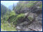 Irgendwann war dann mal gut mit dem Kühlen und Trinken und ich raffte mich wieder auf. Das Wiederanlaufen ist immer unangenehm, vor allem, wenn es auf einer heißen Schotterpiste bergauf geht. Die Steigung hielt nicht lang und nach eineinhalb Kilometern ging links der Zubringer zum Jägersteig ab. Der Blick in den ausgetrockneten Seinsbach samt dem Ursprung der Steine, dem urigen Kampenleitenkopf und -spitze, zeigte mehr eine Riesen-Reiße als einen Bach und ließ die Naturgewalten erahnen, die hier wüten können.