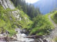 Der Weg hinunter stelle sich als schwer laufbar heraus und malträtierte meine Oberschenkel in die andere Richtung. Am Jöchel wurde es dann flowiger, da weniger steinig. Allerdings war der erhoffte Halbschatten zwischen den Bäumen nur sprichwörtlich die heiße Luft in den Latschengassen. Mein Trinkwasser hatte mittlerweile mindestens Körpertemperatur und ich halluzinierte von einem tröpfelnden Wasserhahn an der nächsten Alm - die mit den fünf Schreibweisen: Fereinalm, Fereinsalm, Vereineralm, Vereinalm, Vereinsalm. Alle Schreibweisen sind auf verschiedenen Karten und Wegweisern zu finden. Hier im Oberland wird die orthografische Freiheit noch voll ausgelebt. Von weitem sah ich schon die Fahne vor der Alm wehen und das Bild vom tröpfelnden Wasserhahn wurde deutlicher. Die Vorfreude ließ mich schneller werden und dann überraschte mich mitten auf der Wegkreuzung vor der Alm eine Tränke mit sauberem, ganz kaltem, fließendem, klarem, frischem, sprudelndem Wasser: ganz für mich alleine. Was zuerst? Trinken? Waschen? Trinkwasser wechseln? Hafermehl anfüllen? Alles auf einmal? Irgendeine Reihenfolge hat sich dann doch ergeben und nach zehn Minuten hockte ich gewaschen mit meinem kühlen Hafer-Trunk im Schatten auf dem Koppelzaun und wollte nie wieder weg. Die Hitze ging nicht wirklich aus dem Körper und so bin ich noch mehrmals zum Waschen an die Tränke gegangen, das kühle Nass über Arme, Beine und auch den Kopf rinnen lassen. Unbewußt habe ich die Füße ausgenommen, sind mir doch nasse Schuhe ein Graus beim Laufen. Ein paar Tage später habe ich in einem Forum gelesen, dass ein Bergläufer seinen ambitionierten Lauf auf dem E5 bei diesen Temperaturen wegen Blasen an den Füßen, aufgrund von nassen Socken vom Kühlen, abbrechen musste. Sehr schade.