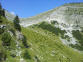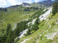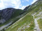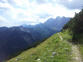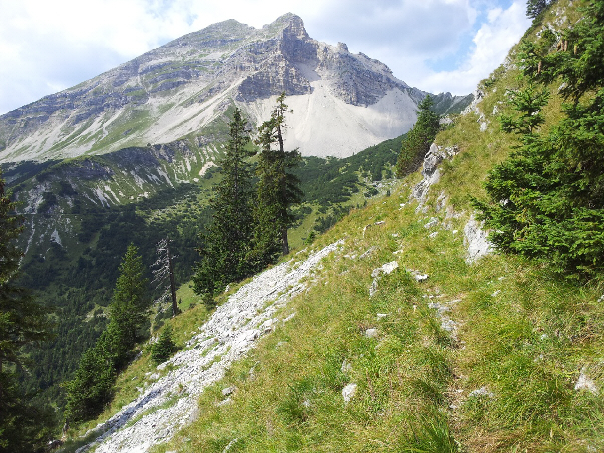 Nach einer Steinreiße wurde der Steig grasig, aber nicht besser laufbar, lagen doch überall lose Steine. Die Balanciererei mit dem Rucksack war irgendwie anstrengend, die Landschaft entschädigte aber vollständig. Noch eine Reiße, noch eine Biegung, ein kleiner Anstieg, dann kam hinter einer Ecke die Soiernspitze in Sicht: beeindruckend und auch beeindruckend hoch. Noch einen Talkessel auslaufen, an einem Latschensaum vorbei und immer die nächsten Kilometer voraus im Blick. Vorbei am Abzweig zum Soiernhaus kommt die nächste Ecke und gibt den Blick aufs Jöchel frei. Der Weg dahin - schmal und steinig. Langsam zwickte der Rücken. Ich sollte mehr Rumpfstabi machen.