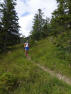 Dieses Wahnsinnsgefühl zum Abheben erleben wir aber erst nach und nach auf diesem pfundigen Downhill, den wir nach vielen Stunden auf den Beinen von Wonne gehoben und von Quellwasser berauscht, quietschfidel hinuntersausen, gut 1000hm bei einem Gefälle von 14,2%, wie Christian unter Berücksichtung des Tangas, oder so ähnlich ;-), ausgerechnet hatte. Ausgelassen wieseln wir die engen Serpentinen hinunter, einer hinter dem andern, es gibt kaum Stufen und auch sonst keine schwierigen Passagen, und bald hat Christian die Idee, diesen sonnenbeschienenen Trail im Spätherbst oder Winter mal hochzulaufen. Heute kitzeln uns Sommergräser und nichts kann uns aufhalten, höchstens eingefangene Zecken. Das prüfen wir hin und wieder an Ort und Stelle, denn zum tödlichen Sprung für dieses Viechzeux ins eiskalte Wasser der Riß, ist es noch ein bisschen hin.