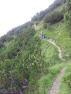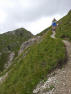 Wir erreichen wieder die Kuppe und machen uns auf zu den "drei Brüdern". Schmal ist der Trail, immer wieder gespickt mit kleinen schrofigen Überraschungen, die wir mit gebotener Vorsicht passieren, zart und lang ist das Gras am Rande des Pfads, tief der Blick hinunter. Immer wieder bleiben wir stehen ... staunen ... genießen. Und nuckeln an unseren Schläuchen. Unausgesprochen die bange Frage, ob wir mit 2 1/2 Litern hinkommen. Es ist heiss, die Hänge dieses Höhenzugs sind der Sonne zugewandt, und auch, wenn sich jetzt mehr und mehr dunkelgraue Wolken zwischen uns und die Sonne schieben, wir schwitzen. Und zum Grasbergsattel ist es noch weit.