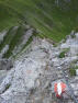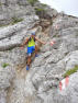 Auf dem Grasbergsattel geht es flach zwischen Latschen dahin, und bald tauchen wieder die "drei Brüder" auf, mächtig gewachsen. Nachdem wir auf dem Trail hierher immer wieder mal gehen mussten aufgrund der steilen Hangneigung, freue ich mich innerlich auf den Grasberg. Klingt hübsch. Ich stelle mir Sommerblümchen auf satten Wiesen vor, durch die sich unser Trail schlängelt, butterweich zu laufen. Erstmal aber geht es ein Stück in den Sattel hinunter, und dann wieder hoch auf Flughöhe. Dort angekommen steht eine Wandertafel: Fleischbank, Schafreuther. Dahinter je ein schwarzer Punkt und dann noch der Hinweis: Nur für Geübte. Schräg schaue ich Christian an. Der kennt diesen Blick. Wiegelt ab, alles nicht so schlimm. Das Gelände wird steiler, der Pfad schwierig. Immerhin sehe ich Blümchen. Dass der Grasberg aber am Westgrat abbricht, damit habe ich nicht gerechnet. Übel der Blick hinunter in die steile, bröselige Rinne. Auf allen Vieren krabbel ich zum Anfang des Stahlseils. Und bekomme sofort Schimpfe. Genauso, meint Christian, ist es falsch. Wenn du wegrutschst aufgrund mangelnder Haftung, dann geht's dahin. Froh, das Seil in der Hand zu haben, drehe ich mich um, schaue durch die Beine und klettere mit Christians Hilfe diese Schlüsselstelle hinunter. Weiter geht's recht anspruchsvoll auf diesem Steig in Richtung Hölzstaljoch, auf dessen steiler Südflanke wir von der Sonne ausgelaugt weiterlaufen, weitergehen und oft stehenbleiben; der Ausblick ist gigantisch. Die Falkgruppe, das Gamsjoch und das Laliderertal weit unten.