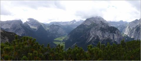 Schnurstracks geht es jetzt auf die Fleischbank zu, steil empor zum Gipfel. Wir aber laufen unten entlang auf dem anspruchsvollen Steiglein, wie dieser schmale und eindrucksvolle Pfad mit Tiefblick in meinem Karwendelführer beschrieben wird. Steiglein. Wie kommt man nur auf diese Verniedlichung! Fantastisch noch immer der Blick aufs Kernkarwendel und ins Johannistal mit der senkrechten Lalidererwand im Hintergrund. Die Falkenhütte sieht man leider nicht - ein guter Grund, ihr bald einen Besuch abzustatten. Langsam wird die Flanke zahmer und wir erreichen die normale Aufstiegsroute zur Fleischbank. Wie es aussieht, hat unser Höhenflug auf diesem langen und teils schwierigen Gebirgspfad sein Ende gefunden. Nicht aber der psychische Höhenflug, das, wofür unsere Trailrunnerherzen schlagen.
