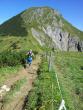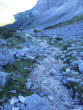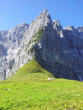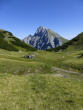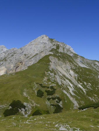 Auch der schönste Trail geht mal zu Ende und wir landen auf dem hinteren Teil des Sattels zwischen Steinfalk und Mahnkopf. Hier beginnt der sehr steile Aufstieg zum Steinfalk. Der Gipfel ist nur für Kletterer mit Helm, da er sehr bröselig und zudem ungesichert ist. Wir gehen nur hoch bis zum Ende des Grashangs, setzen uns dort windgeschützt neben den Steig und packen unser Mittagessen aus. Das übliche 3-Gänge-Menü mit Blick auf die Welt von oben. Schön ist es hier. Einfach nur schön! Auch der Blick auf unseren Rückweg, der uns über den Mahnkopf (2094m) führen wird.