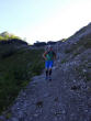 Bald erreichen wir den Sattel, von dem aus es sehr steil zum Mahnkopf (2094m) hoch geht. Den aber nehmen wir erst auf dem Rückweg mit und laufen unterhalb weiter in Richtung Steinfalk (ausgeschildert), auf einem Singletrail, so schön wie der, der hinter uns liegt, aber mit noch mehr Abwechslung und noch besserer Aussicht auf die höchsten Gipfel des Karwendels, versinken ein paar hundert Meter im Grün, tauchen wieder auf und landen im Himmelblau.