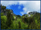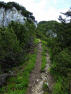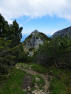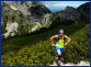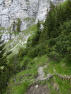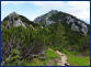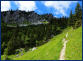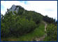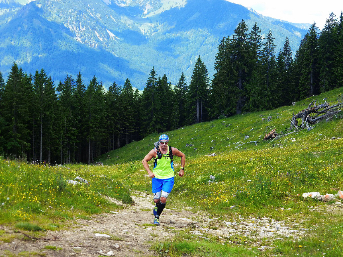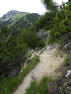 Ich habe mich zu früh geärgert, denn nur wenige Höhenmeter weiter kam der Abzweiger ins Kar. Der Blick hoch auf das üppige Grün, eingerahmt von felsigen Formationen und gekrönt von zwei riesigen Backenzähnen aus Kalkstein, der Lacherspitze, machen mir Vorfreude auf den Trail. Die Befürchtung, dass dieses Kar im Schatten liegt und der Steig matschig sein könnte, war bald verflogen. Nur der Einstieg ins Kar war matschig, dort wo es noch flach war. Trocken und technisch leicht zu laufen schlängelt sich der Trail durch Latschen und lichten Wald nach oben, nicht sehr steil und meist in der Sonne. Über die Lacherspitze aber schieben sich die ersten grauen Wolken, was mich erst gar nicht freut, später aber immer mehr, denn die direkte Sonneneinstrahlung jetzt Ende Juni ist schon heftig und belastet mich.