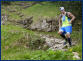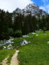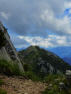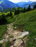 Unter dem grauen Vorhang aber läßt es sich angenehme dahintrotten, Meter um Meter, und die am Rande der Wolkenfelder herunterbrechende Sonne taucht das üppig ins Grün geschossene Kar samt namenlose Gipfelchen in verdientes Licht. Schattenpiele.