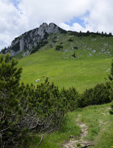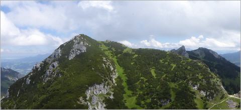 Also zurück, auch wenn es mir dann doch leid tut, nicht heute schon auf dieses markante Joch gelaufen zu sein. Dieser Gedanken verfliegt aber rasch wieder, meine Konzentration ist auf den Trail vor mir auf diesem Verbindungskamm zur Lacherspitze gerichtet. Die ist bald erreicht und bleibt linker Hand liegen. Es geht hinunter zur Kesselwand, wo ich ordentlich Gas gebe, weil vor Steinschlag gewarnt wird. Ich schaue, wo auf diesem breiten Weg die meisten Gesteinsbrocken liegen und laufe nahe der Wand entlang bergauf. Massig und breit liegt jetzt der Wendelstein vor mir, ganz anders, als von Fischbachau aus gesehen, wo er sich als schmale Pyramide zeigt. Ich laufe auf die Zeller Scharte zu, sehe unten die Schienen der Wendelstein Zahnradbahn und darüber den naturbelassenen Panoramaweg zum Gipfel. Den geht es hoch. Kaum am Gipfel angekommen, wabern Wolkenfetzen herum, dafür aber fehlt das Gewusel der sonst so zahlreichen Besucher. Nix los heute. Oh Wunder! Zudem ist es absolut windstill, und die Sonne läßt sich auch wieder blicken. Ich ziehe mein Shirt aus, hole mein Fläschchen aus dem Rucksack und stärke mich. Zwei, die mich schon die ganze Zeit beobachten und mich an die in Gold getauchten Straßenkünstler erinnern, bekommen es auch.