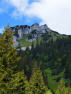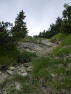 Noch ein Stück laufe ich durch das Wäldchen, der Pfad ist steiler geworden und ein wenig nass, bevor ich ein freies Wiesengelände erreiche und die beiden Felsblöcke der Lacherspitze zum Greifen nahe vor mir sehe. Ein unschwieriger Weg durch eine Latschengasse bringt mich direkt zum Gipfelaufbau. Noch 5m klettern, und man steht am Kreuz. Ich setze mich unterhalb in eine Nische, von wo aus ich durch einen Felsrahmen hinüberschaue zum Techno-Berg, wo gerade eine Art Lightshow inszeniert wird. Oder sind es Schattenspiele?