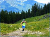 Mit dabei ist heute meine neue GPS-Uhr, die TOMTOM Runner 1, eine leicht zu bedienende Uhr mit extragroßem Display für Halbblinde wie mich und den wichtigsten Funktionen. Zu meiner Überraschung lasse ich mich hier in den Bergen kaum von ihr ablenken. Anders, als im Englischen Garten, wo ich häufig auf die Pace guckte, was mich zum schnelleren Laufen motivierte. Geschwindigkeit aber in den Bergen ist für mich kein Thema; flowig soll der Lauf sein und meine Seele streicheln. Der geht es auch schon besser, da ich den ersten Trail entdeckt habe, der unbeschildert rechts ab geht. Ich bleibe kurz stehen. Zwei junge Damen auf dem Weg nach unten rufen mir zu: "passt scho!" Also passt es scho. Leider war es nur eine längere Abkürzung und ich lande wieder auf Asphalt. Dann erneut ein Abzweiger. Links der Pfad zum Wendelstein, rechts weiter auf Asphalt in Richtung Lacherspitze und Wildalpjoch. Bled!