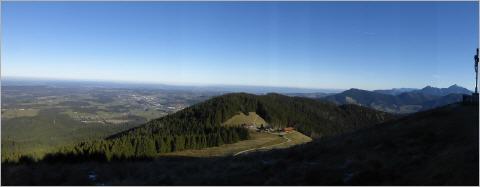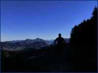 Erst ein Ratsch, dann das Leeren meines Fläschchen mit Hafermehl, dem ich heute BCAAs mit künstlichem Orangengeschmack beigemischt habe, hält mich dann doch ein wenig zu lang auf. Als ich die Baumgartenschneid hinunterlaufe, friert es mich ordentlich an den Pfoten. Auch diesen Trail hinunter kenne ich nur vom Hochlaufen, und auch der macht hinunter einen riesen Spaß. Bald lande ich an der Riedersteinkapelle. Klack, ein Foto, und weiter gehts zum Berggasthaus am Galaun. Ein Stück davor treffe ich ein lustiges aber völlig zerknirschtes junges Pärchen. Ich hatte sie gefragt, ob das Gasthaus geöffnet hat, und sie schütteln den Kopf und sagen, Dienstag geschlossen. Sie hatten sich darauf gefreut, dort einzukehren und den Nachmittag in der Sonne zu genießen. Wie gelähmt standen sie vor mir und wußten nicht, was tun. Riedersteinkapelle ... ja, schöner Ausblick, kennen wir schon, dort aber gibt es kein Weißbier und keinen Braten. Eine Kneipe wäre jetzt recht, seufzte die sympathische Blondine und lachte. Wenn die wüßte, was mein heutiges Motto ist.
