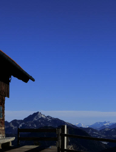 Ich aber musste und begab mich auf die Spuren meiner Kindheit. Der Wendelstein war mein erster Gipfel. Los ging's mit einem Sprung über eine hüfthohe geschlossene Eisentüre mit der Aufschrift "Durchgang verboten". Alle waren sie hier drüber geklettet, jedenfalls die paar wenigen, die heute hier oben waren. Ein gut gesicherter Spazierweg führt in vielen Serpetinen die steile Felswand hinauf, und ich fragte mich, wie es den meisten, auch mir, hier ginge, wenn es kein Geländer gäbe. Beim Hinunterschauen hätte ich mich fest mit dem Rücken an den Felsen gelehnt, den Schwanz eingezogen und wäre auf allen Vieren um so manche Kurve gekrochen. So aber ging es flott dahin und ich landete einmal mehr auf einer Plattform - die Zugspitze lässt grüßen. So hässlich es auch hier oben ist, der Ausblick Mitte November war fantastisch, vor allem der in die Ferne.