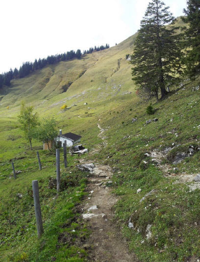 Auch wir machen uns weiter auf den Weg nach unten, laufen einen Pfad, der die Forststraße abkürzt und landen sogleich bei den nächsten beiden Almen (1400m). Der Moaralm und der Enzianhütte. Zwei urige Almen, allerdings mit stark eingeschränktem Platzangebot auf den kleinen Terrassen. Unser Weiterweg führt unterhalb der Moaralm zwischen zwei Almhütten durch, danach ist der Weiterweg nur zu erahnen. Es geht über eine Wiese und von dort hinunter zum Mischwald. Der Schatten hat uns wieder. Auch hier ist die Orientierung nicht ganz leicht, da es viele Wanderwege und -pfade gibt, die sich verzweigen. Wir erreichen einen Pfad, an dessen Anfang Steinmännchen stehen. Bald wird er steil und führt in ein schmales Kar. Nochmal wird es steiler, an ein Laufen ist nicht mehr zu denken. Mehrmals geht es über kurze Wiesenstückchen, und zweimal rutsche ich seitlich über Gras. Mein Schuh, so treu er bisher war, kann das nicht. Ich werde unsicher und hoffe, dieses steile Gelände bald hinter mir lassen zu können. Es wird nochmals steiler. Christian ist hier fast wie eine Gemse unterwegs, mit dem Feline, ich dagegen langsamer als die Kontinentalplattenverschiebung. Aus die Maus. Ich stehe mit dem Rücken zur Wand. Das sieht auch ein nicht mehr ganz junges Paar, das diesen Steig heraufkommt (Wer hat die gerade in diesem Moment hier auftauchen lassen? - eine ernstgemeinte Frage). Wann dieses steile Stück zuende ist, frage ich sie, und unisono kommt zurück, das wird nach unten hin noch schlimmer, deshalb machen wir diese Route im Aufstieg. Und wenn ich hier schon solche Probleme habe ... Ich schaue der Christian an ... Ok, zurück nach oben.