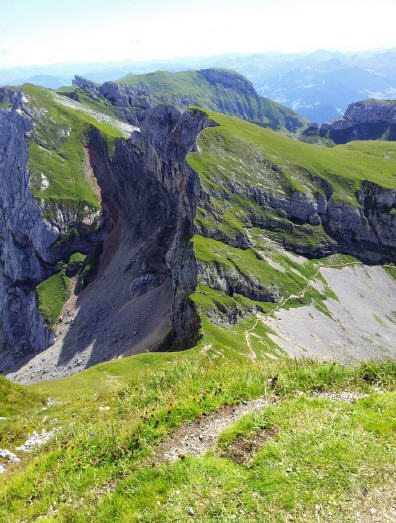 Als ich ein paar Meter vom Gipfelkreuz weitergehe, kippe ich fast aus den Latschen: Steil fällt der hier so zahme Berg ab und drüben ist unser nächstes Etappenziel, der Hochunnütz. Dachte ich noch, beide Gipfel sind mit einem Grat verbunden, so sehe ich keinen Weiterweg. Weit drüben oberhalb eines Felsbandes entspringt zwar ein Pfad, sonst sehe ich nichts. Christian dagegen ist völlig entspannt, guckt auf sein Handy und deutet zurück. Wir laufen los. Nach etwa 100m windet sich ein sehr steiler Pfad in engen Serpetinen hinunter, ca. 70hm auf 100m. Vorsichtig setzte ich meine Schritte, um nicht wegzurutschen. An einer Stelle wartet Christian auf mich, und ich ahne warum. Ich bleibe stehen und finde sogar eine Abkürzung, um diese Kurve innen gehen zu können. Die weitere Wegführung, die Christian besonders geglückt findet, bringt uns in steilem und felsigem Gelände unterhalb des Gipfels hinüber zu einem Felsband. Uups! Kraxeln ist angesagt. Meine Müdigkeit ist wie weggeblasen. Ich mache einfach das, was mir Christian klettertechnisch beigebracht hat und überwinde relativ problemlos diese Schlüsselstelle. Oben stehe ich dann endlich auf dem Pfad, der von drüben so aussah, als entspränge er aus dem Nichts. Geholfen bei der Kraxelei hat mir auch mein Schuh, der Dynafit Feline SL, der sich gut in den Fels krallt.