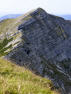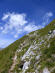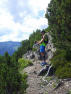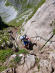 Auf der anderen Seite des Grats steigen wir kurz bergab, passieren den ulkig rundgeformten Streichkopf (2243m), queren eine Flanke und erreichen die Schlüsselstelle: Das Rote Klamml. Ein dank Stahlseile leicht zu kletternder Kamin. Da hier wohl keiner die Verhaltensregeln in den Bergen kennt - Bergauf hat Vorfahrt! - hangelt sich einer nach dem anderen am Stahlseil hinunter, bis es Christian zu dumm wird, hochklettert und den Weg absperrt. Endlich kann ich hoch, und zu meiner Überraschung ging das ganz leicht und ohne weiche Knie. Auch oben am Weiterweg mit Stahlseil wieder Stau und einige, die nicht dort warten, wo man nicht runterfallen kann, sondern genau an der engsten Stelle. Wie eine Kakerlake bazel ich mich an die Wand und lass die anderen vorbei.