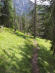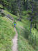 Das Kreuz des Namenlosen ist erreicht, der Schweiß fließt in Strömen. Zuletzt nur Wasser getrunken. Die Elektrolyt-Tabletten schon längst weg. Erste muskuläre Probleme stellen sich ein, mein Fuß knickt wiederholt ein, zum Glück schmerzfrei. Da zeigt sich wieder, wie wichtig Barfußlauftraining zur Stärkung der Sprunggelenke ist. Möchte auch bald wieder einen kürzeren Berglauf mit meinen Barfußlaufschuhen machen. Zum Wandern habe ich ihn immer an. So ... das war nun wirklich der letzte Anstieg. Jetzt kann er kommen, der Downhill. Da ist er auch schon: Der noch sanfte Pfad bricht steil ab und wird ruppig. Richtig heftig. Steiler als steil. Felsig und mit fetten Schrofen durchsetzt, selbst Wanderer, kann ich mir vorstellen, kommen hier ins Schleudern. Mein Stöcke geben mir Halt, langsam geht's voran. Christian ist optimistisch und ruft mir zu, wird gleich besser. Das höre ich gefühlt hundert Mal. Nur besser wird nix. Bei den Fichten dort unten, meint er dann, da ist Hummus, da wird es gut. Ein paar Fichten ragen weiter unten aus dem steilen Gelände, das weiterhin steil bleibt.